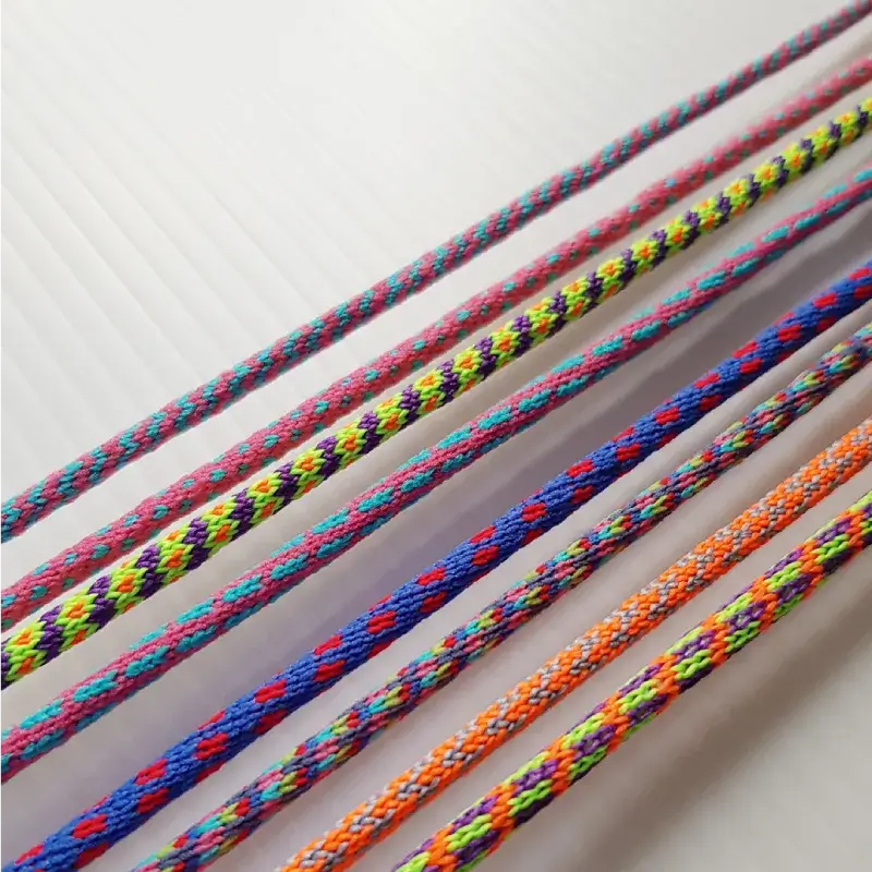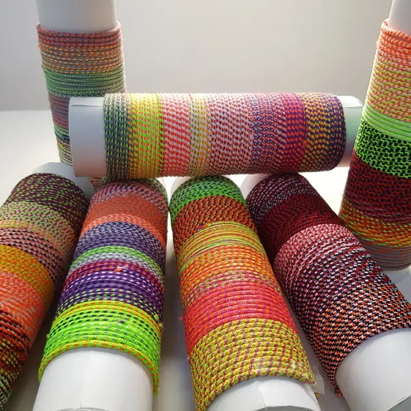* 本機為花式圓筒針織機,操作者可藉由鉤針排列、原料顏色及排列變化織造出不同紋路之產品;產品用途廣泛,適用範圍可為鞋帶、識別帶、成衣帶及手提帶等用途。