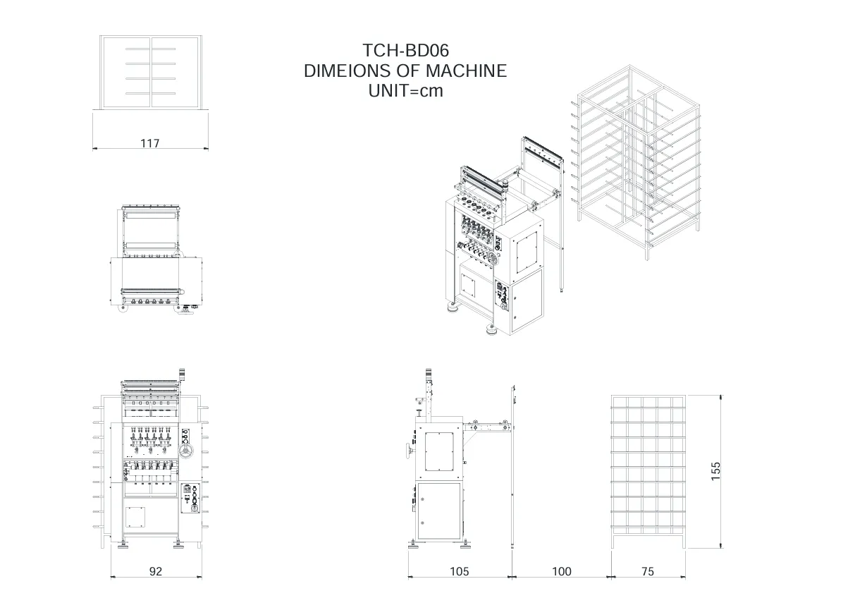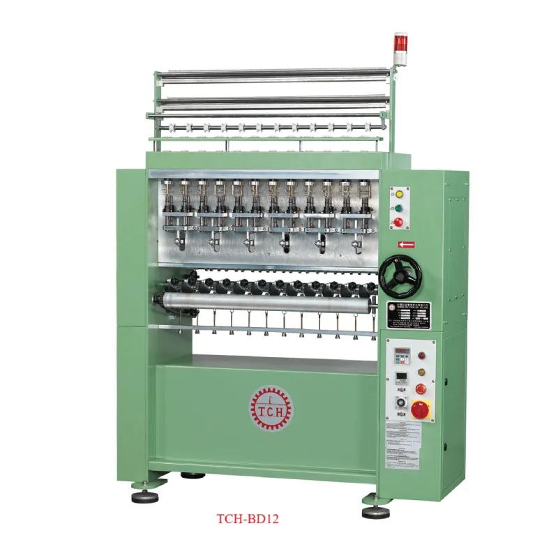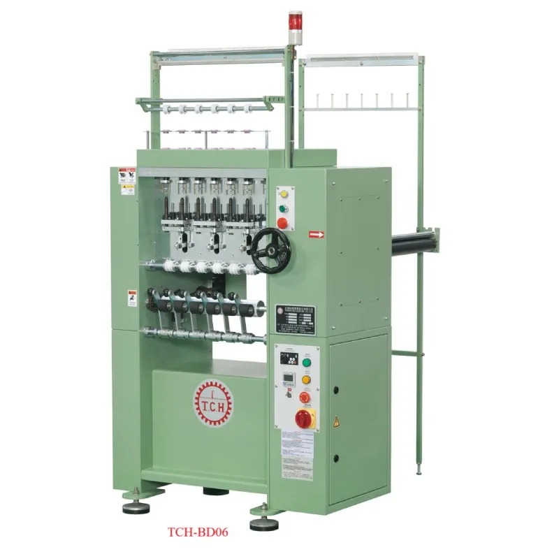TCH-BD06/12具有速度快、安靜、佔地空間小、停機率低之多重優點;可生產直徑從2MM~12.5MM之圓帶,針筒針數有4/6/8/12/16針等(選用配備),原料可使用一般人造纖維或天然纖維,中心部位可依針筒大小包入任何填充材料,作為包心帶。產品可應用為百葉窗帶、拉繩帶、鞋帶、拉鍊包心帶、眼鏡帶、吊床帶及裝飾帶等等。